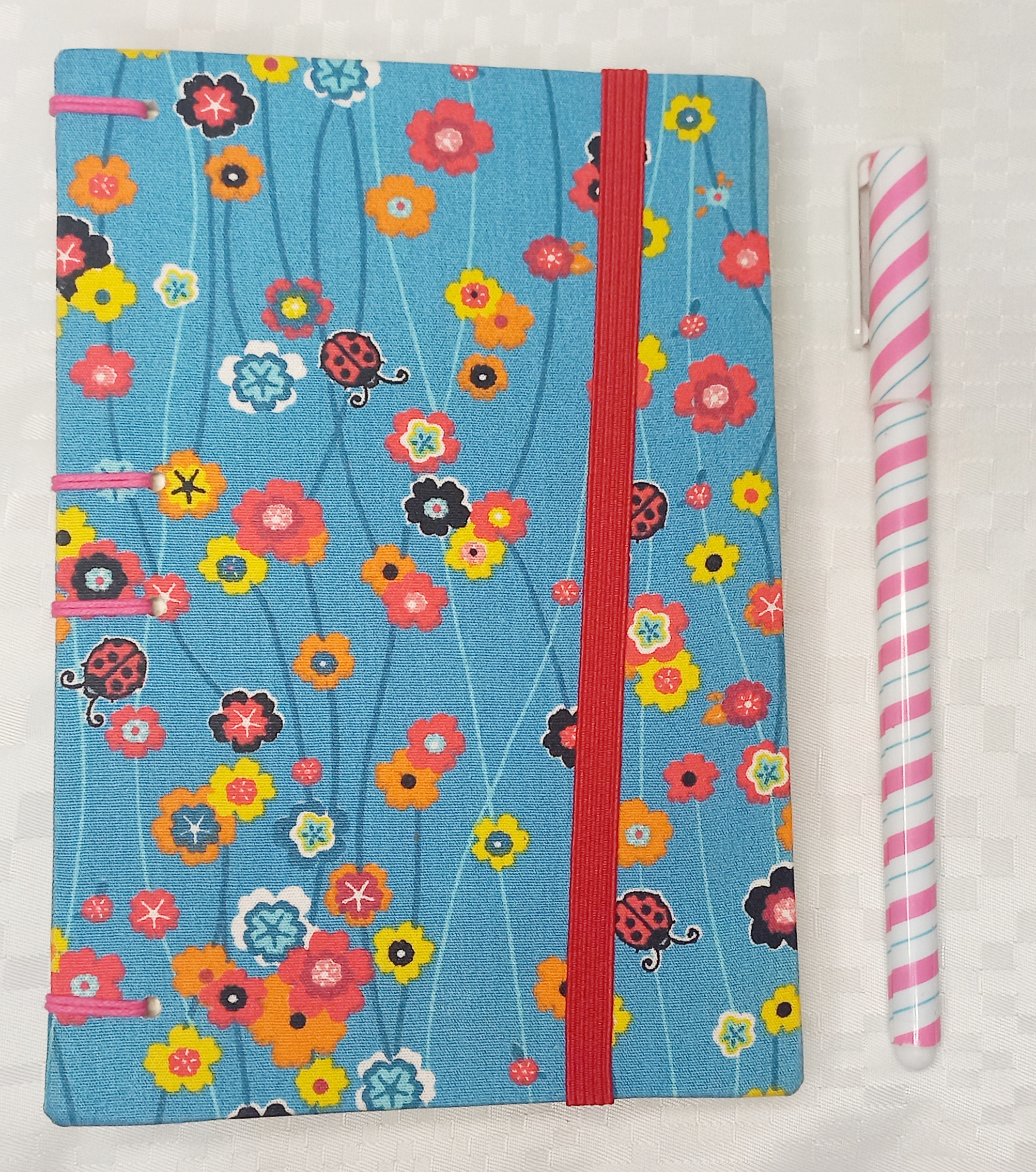 - Também possui porta caneta lateral em elástico, fita marcadora colorida (coordenado) e envelope personalizado interno revestido com o mesmo tecido da capa